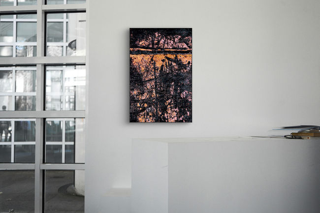 The painting thrives on strong contrasts between deep black and bright, warm colour accents. The fragmented structures and irregular shapes create an exciting dynamic between density and dissolution. Dark surfaces seem to spread out, while hidden layers become visible underneath and open up new associations. In its abstraction, the work remains open to interpretation and conveys a sense of movement, depth and change.